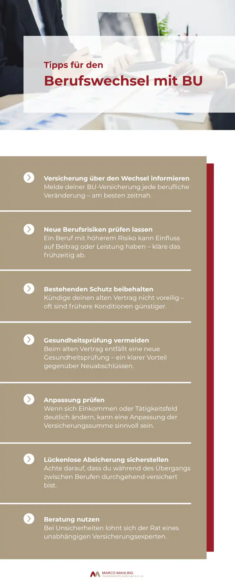--> Versicherung über den Wechsel informieren Melde deiner BU-Versicherung jede berufliche Veränderung - am besten zeitnah. --> Neue Berufsrisiken prüfen lassen Ein Beruf mit höherem Risiko kann Einfluss auf Beitrag oder Leistung haben - kläre das frühzeitig ab. -->Bestehenden Schutz beibehalten Kündige deinen alten Vertrag nicht voreilig - oft sind frühere Konditionen günstiger. --> Gesundheitsprüfung vermeiden Beim alten Vertrag entfällt eine neue Gesundheitsprüfung - ein klarer Vorteil gegenüber Neuabschlüssen. --> Anpassung prüfen Wenn sich Einkommen oder Tätigkeitsfeld deutlich ändern, kann eine Anpassung der Versicherungssumme sinnvoll sein. -->Lückenlose Absicherung sicherstellen Achte darauf, dass du während des Übergangs zwischen Berufen durchgehend versichert bist. -->Beratung nutzen Bei Unsicherheiten lohnt sich der Rat eines unabhängigen Versicherungsexperten.