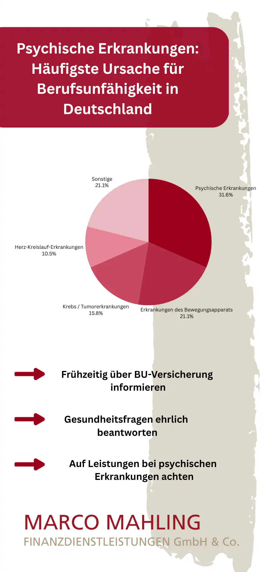 Statistiken zeigen, dass die Hauptursachen für Berufsunfähigkeit sich in den letzten Jahrzehnten drastisch verschoben haben. Psychische Erkrankungen und Verhaltensstörungen, wie Depressionen oder das Burnout-Syndrom, sind heute die häufigsten Gründe für einen Verlust der Arbeitskraft. Je nach Studie und Erhebungsmethode sind sie für 30 bis 40 Prozent aller Fälle von Berufsunfähigkeit verantwortlich. Weitere häufige Ursachen sind Erkrankungen des Muskel-Skelett-Systems, Krebs und Herz-Kreislauf-Erkrankungen.