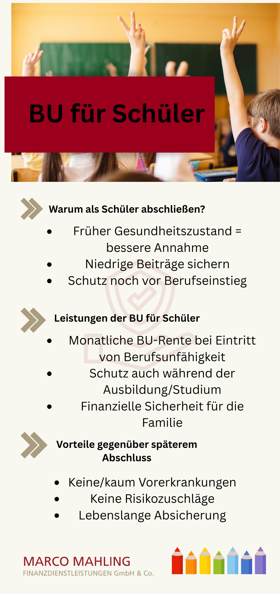 Da dies nicht unbedingt im Handumdrehen gemacht ist, helfen wir Ihnen wo wir können und unterstützen Sie umfassend bei der Suche nach der passenden BU für Schüler!