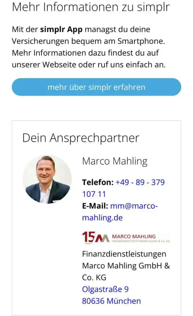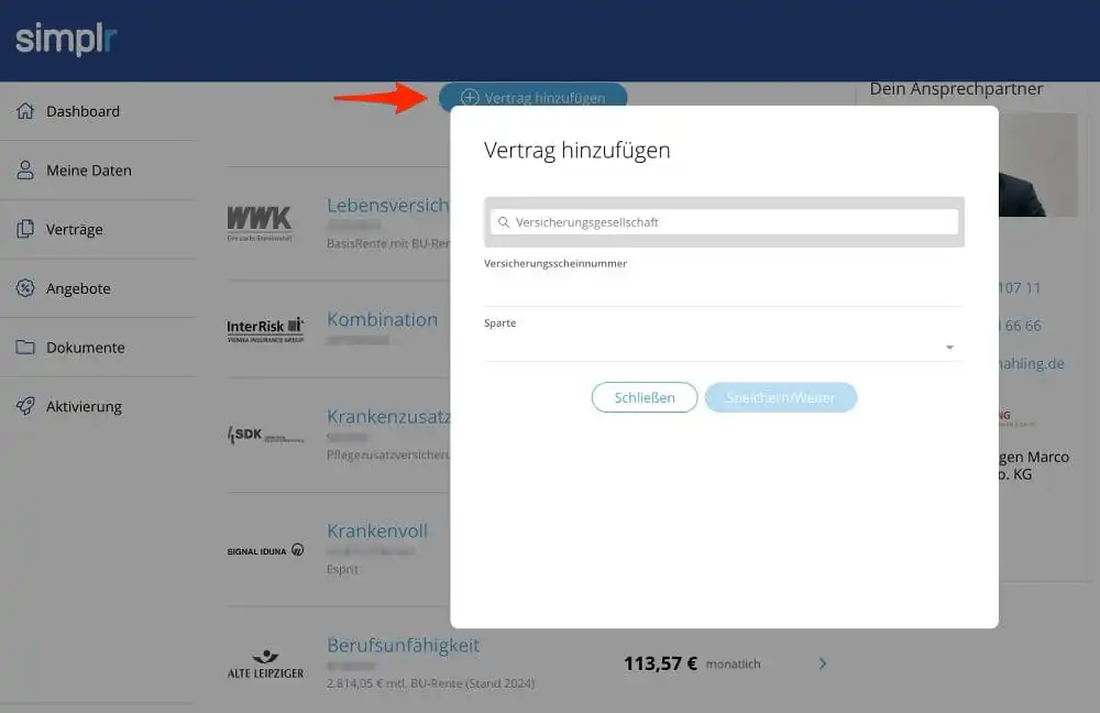 Gut zu wissen: Über simplr können Sie auch Verträge managen und Dokumente hochladen, die nicht in unseren Bestand fallen, hier ist etwa die betriebliche Altersvorsorge zu nennen, die über den Arbeitgeber läuft.