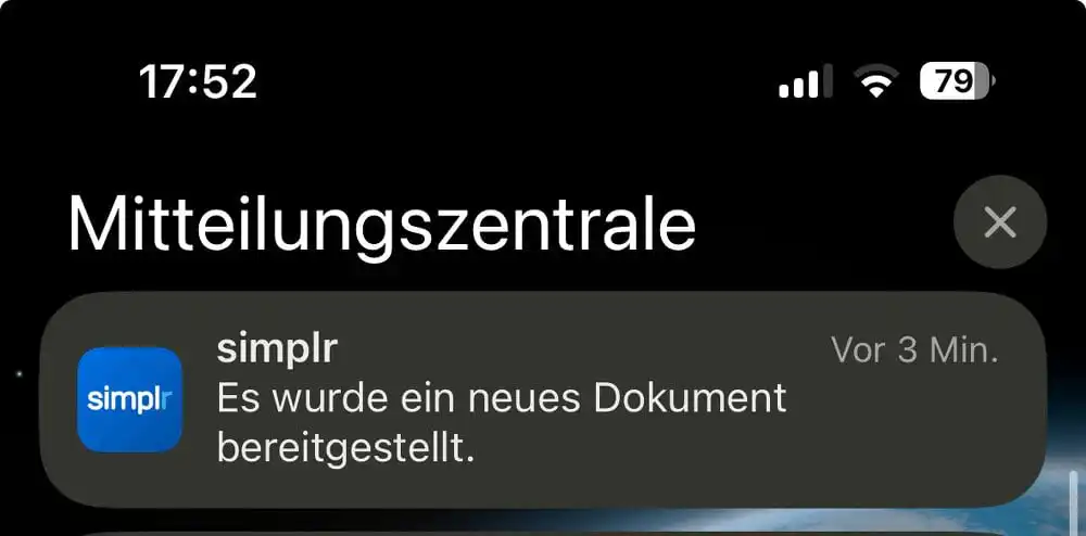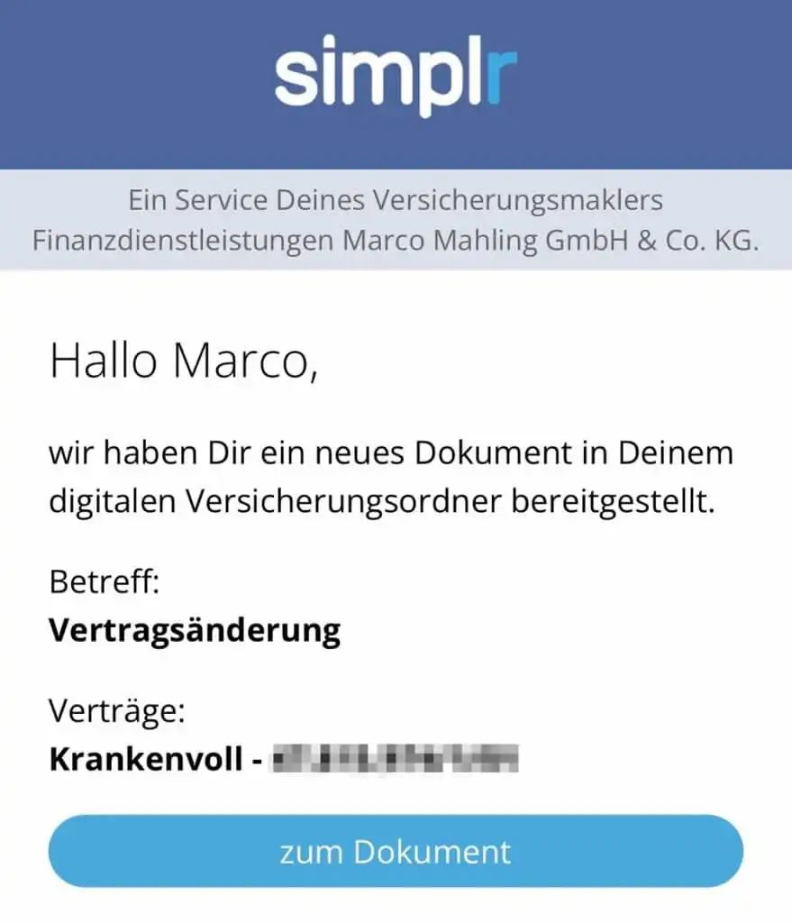 Wurde Ihr Vertrag in unseren Bestand übernommen, werden Sie von simplr nun in Echtzeit über alle frisch hochgeladenen Dokumente informiert. Sie bekommen also eine Benachrichtigung per E-Mail, wenn etwa eine neue Beitragsrechnung oder eine Police auf Sie warten.