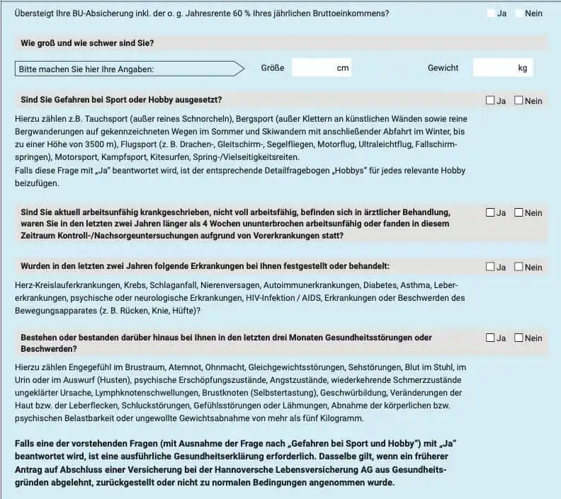 Das Besondere an der Akademiker BU der Hannoverschen ist, dass nur drei Fragen zum gesundheitlichen Zustand, eine Frage zur Gestaltung der Freizeit und die Standardfrage zu Größe und Gewicht gestellt werden. Vergleicht man dies mit der deutlich umfangreichen Gesundheitsprüfung anderer Berufsunfähigkeitsversicherungen wird deutlich, wie viel dem potenziellen Versicherungsnehmer hier „erspart“ wird.