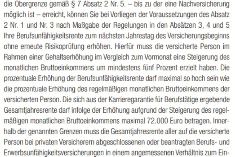 Ein Minuspunkt ist in der technischen Ausgestaltung leider immer noch vorhanden, dass die Beitragsdynamik nur bis zu 4.000 € mtl. BU-Rente gilt. Seit dem November Update von den Versicherungsbedingungen gibt es eine gute Karrieregarantie, welche bis 6.000 Euro mtl. BU-Rente geht. Steigert sich IHr Gehalt um mind. fünf Prozent, können Sie im selben Umfang auch Ihre mtl. BU-Rente erhöhen.