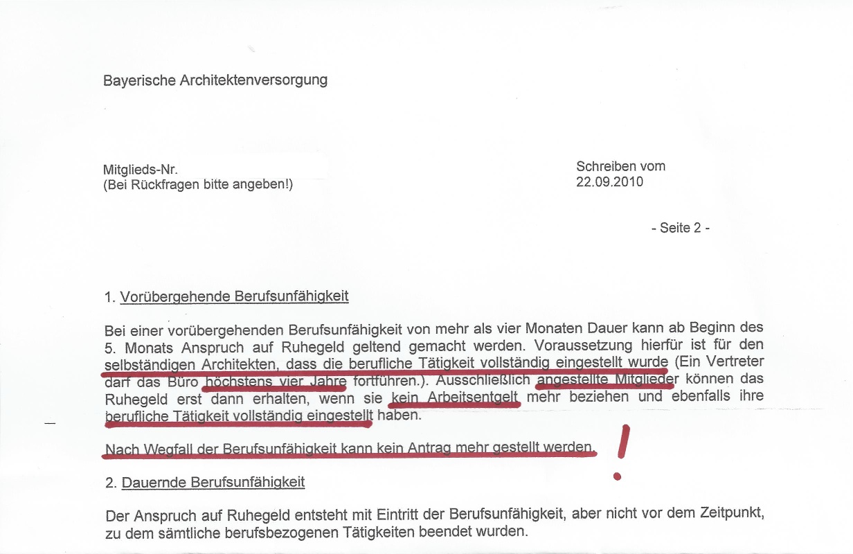 Nachlesen können Sie den Anspruch auf Berufsunfähigkeitsversicherung Versorgungswerk in diesem Auszug von der bayerischen Architektenversorgung: Auszug Architektenversorgung