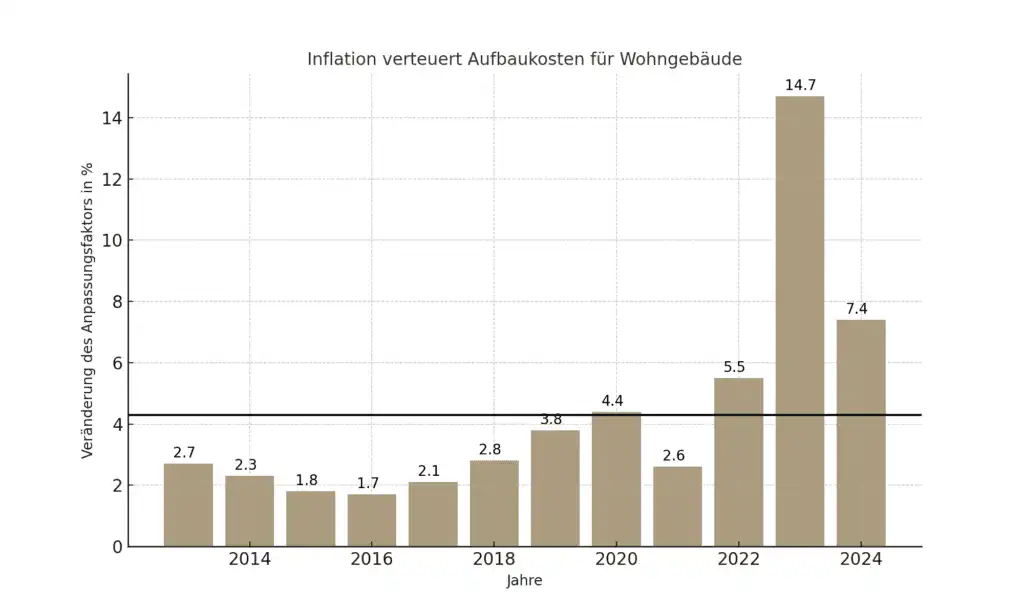 In den letzten Jahren war der Anstieg der Kosten für Baumaterialien, aber auch Handwerker und Bauunternehmen sehr spürbar. Kommt es zum Versicherungsfall und muss ein Wohngebäude neu aufgebaut oder instandgesetzt werden, sind die Kosten hierfür ebenfalls auf dem neuen, hohen Niveau, wodurch Versicherer gezwungen sind, auch die Prämien nach oben zu korrigieren.