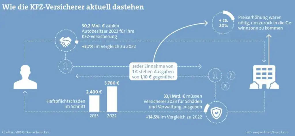 Es wird erwartet, dass die Preise im Durchschnitt um 10 % steigen werden. Die Branche hat jahrelang versucht, ihre Prämienpolitik mit günstigeren Angeboten zu unterbieten und steht nun vor der Herausforderung steigender Schadenkosten. Während der Corona-Pandemie ging diese Strategie noch auf, da aufgrund von Beschränkungen weniger Fahrten unternommen wurden und somit auch weniger Unfälle passierten. Trotzdem können Kfz-Versicherungen selbst mit einer Preisanpassung von 10 Prozent nicht aus den roten Zahlen kommen. Die Branche hat sich zu lange damit begnügt, billige Prämien innerhalb ihrer Preispolitik anzubieten. Laut Jonas Krotzek, dem Zentralbereichsleiter der Deutschland-Tochter E+S Rückversicherungsgesellschaft, wäre eine Preiserhöhung von fast 20 Prozent nötig, um wieder Gewinne einzufahren.