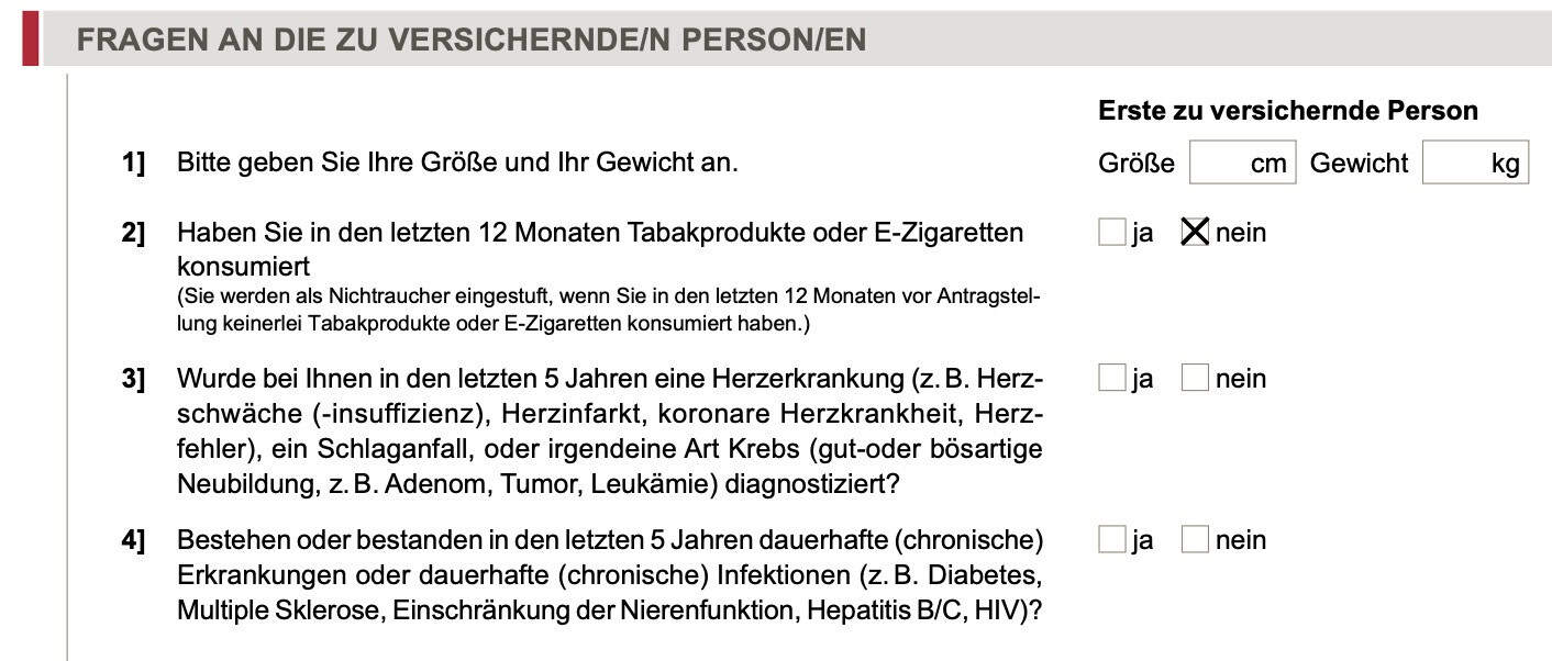 Die Fragen zur Gesundheit sind über eine Gesundheitserklärung zu beantworten: