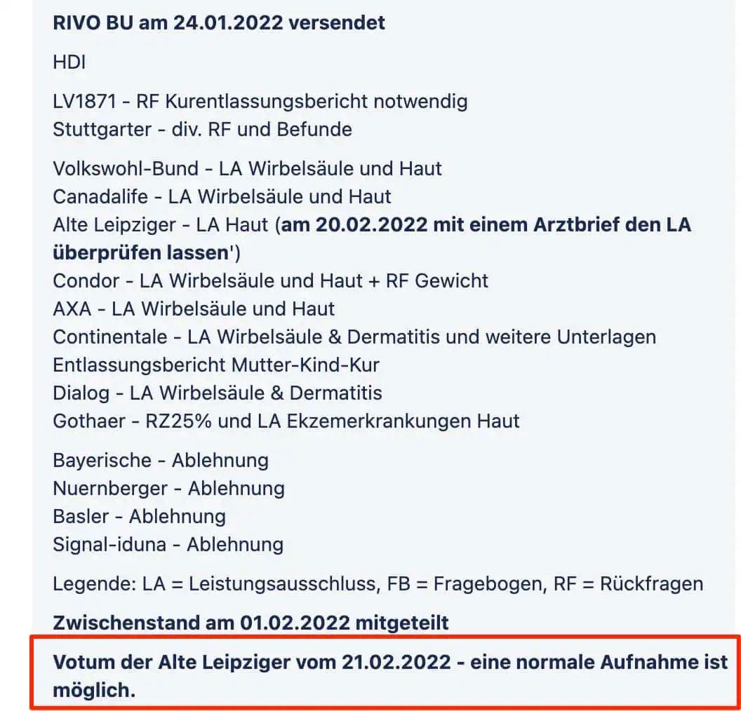 Ab und an gibt es jedoch auch immer wieder Situationen, wo eine Aufteilung der BU nicht möglich ist. Es kann immer wieder an der Risikoprüfung scheitern, sodass am Ende vielleicht nur ein Anbieter eine „normale Annahme“ zulässt.