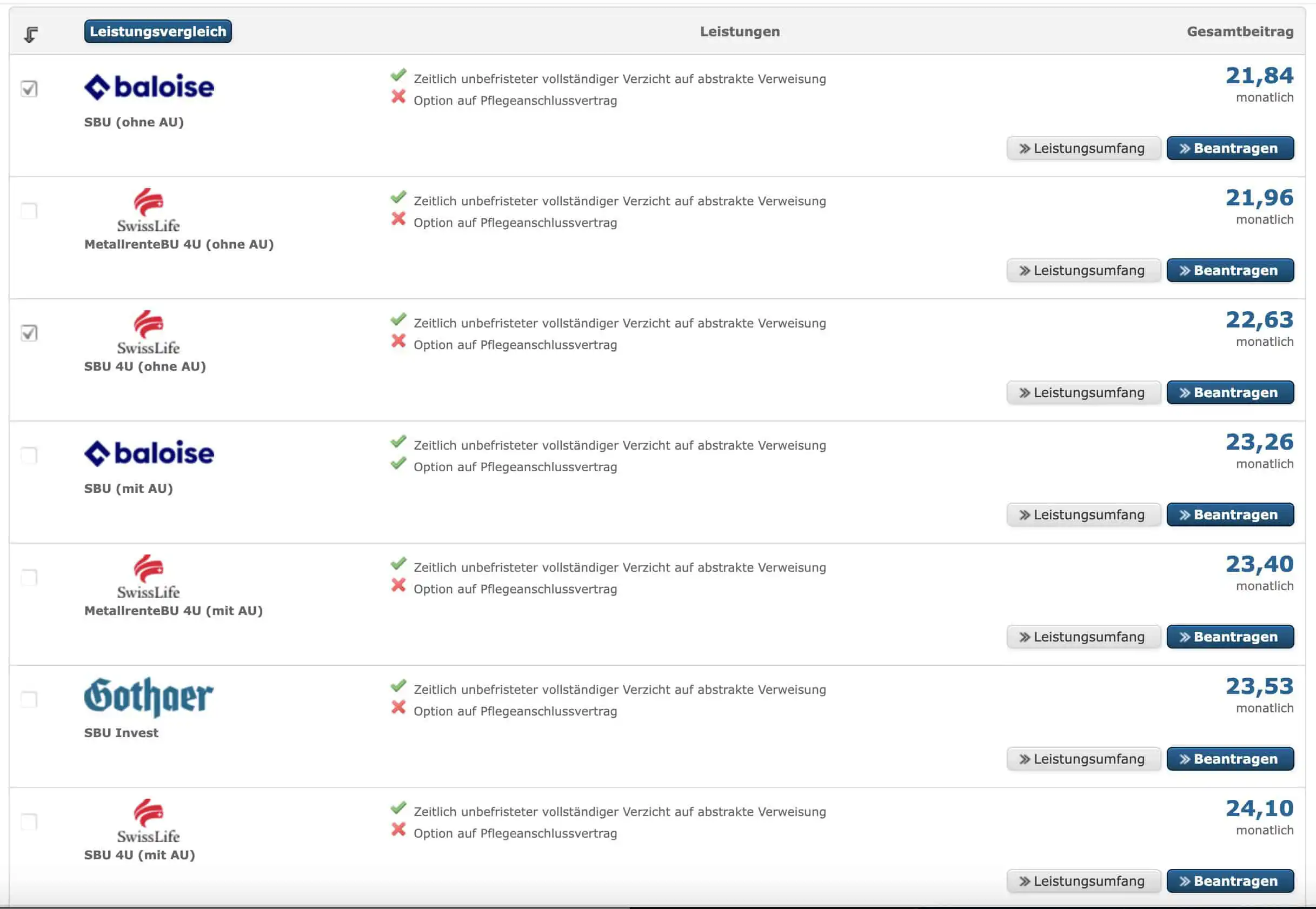 Hier die Anbieter in der Übersicht, sortiert nach dem mtl. Beitrag:
