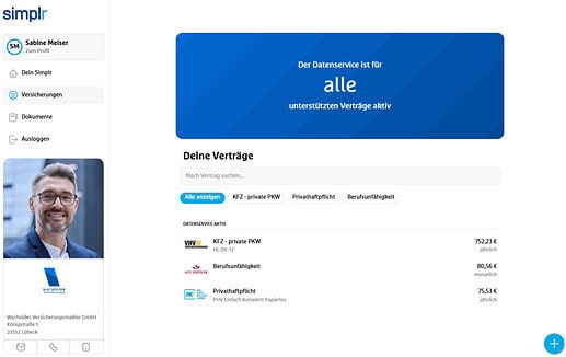 Mit unserem digitalen Kundenordner simplr haben Sie all Ihre Versicherungsverträge stets griffbereit und organisiert – jederzeit und überall. Die Plattform, die Sie bequem als App oder nun auch in der Web-Version nutzen können, ermöglicht es Ihnen, all Ihre Versicherungsdokumente sicher zu speichern, hochzuladen und zu ordnen. Sie können nicht nur einfach auf Ihre Verträge zugreifen, sondern auch sicher mit uns kommunizieren und wichtige Unterlagen wie Angebote oder Antragsunterlagen unkompliziert teilen.