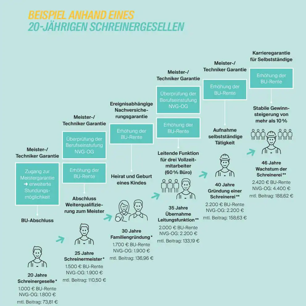 Aber zurück zur BU der LV 1871: Hier kann die maximale Karrieregarantie derzeit bis zu 7.400 Euro betragen, wenn der Versicherungsnehmer den “richtigen” Beruf, wie etwa im Bereich Softwareentwicklung, Data Science, Wirtschaftsingenieurwesen oder weitere MINT-Berufe, hat. Dies bedeutet im Umkehrschluss, dass körperliche, soziale und nicht-akademische Berufe deutlich geringere Möglichkeiten der Erhöhung haben. Auch hier wurde die LV 1871 tätig und veröffentlichte nun ein neues Konzept, welches vor allem für Fachkräfte aus Industrie und Handwerk gestaltet ist.