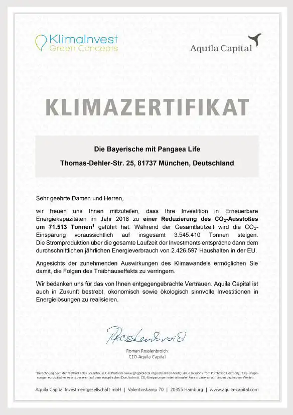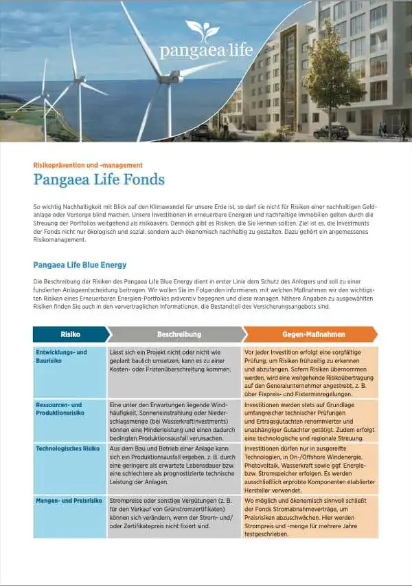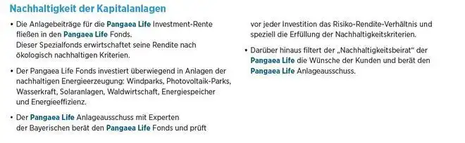Die Pangaea Life Versicherung ist eine Tochtergesellschaft der Bayerischen und vereint Nachhaltigkeit (und somit auch den Schwerpunkt Klimaschutz) mit einer soliden Rendite und macht das Investieren in erneuerbare Energien und nachhaltige Immobilien wirtschaftlich attraktiv. Bei der Pangaea Life handelt es sich um einen Spezialfonds, der aktuell nicht auf gÀngigen Finanzportalen wie Onvista usw. gelistet ist, aber 9,1 Prozent bzw. 8,6 Prozent jÀhrliche Rendite seit Auflage aufweisen kann. Daneben verhÀlt sich der Fonds losgelöst von Börsenschwankungen und bietet eine runde ErgÀnzung zum bereits vorhandenen Aktien- und ETF-Depot. Es besteht die Möglichkeit einer Einmalanlage und/oder eines monatlichen Sparplans. Zu der genauen Ausgestaltung kommen wir weiter unten erneut.