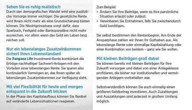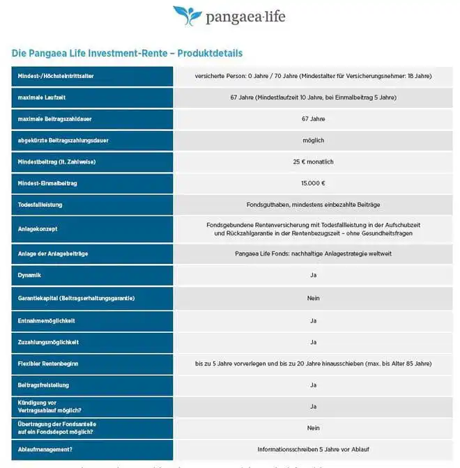 ZusĂ€tzlich stellt Pangaea Life durch ihre Option der lebenslangen Rente oder Einmalauszahlung eine interessante Vorsorgelösung dar, die individuell an die finanziellen BedĂŒrfnisse der Anleger angepasst werden kann. Auch die Möglichkeit, die Investmentrente als Basisrente abzuschlieĂen und von steuerlichen Vorteilen zu profitieren, erweitert das Angebot.