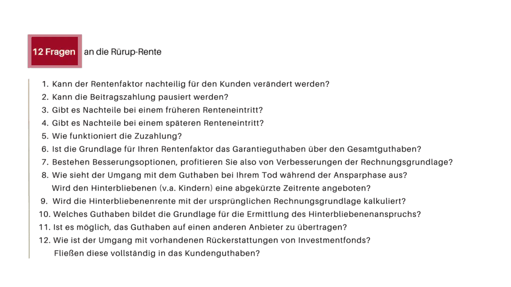 Die Vertragsbedingungen sind hier deckungsgleich zu denen der Bayerischen Basisrente. Letztgenannte schafft es, die zwölf wichtigen Fragen an jede Basisrente durchweg positiv zu beantworten. Hierdurch etabliert die Bayerische nicht nur eine hohe QualitĂ€t, die bei vielen anderen RĂŒrup-Renten lange auf sich warten lieĂ. sondern auch erfrischende Transparenz.