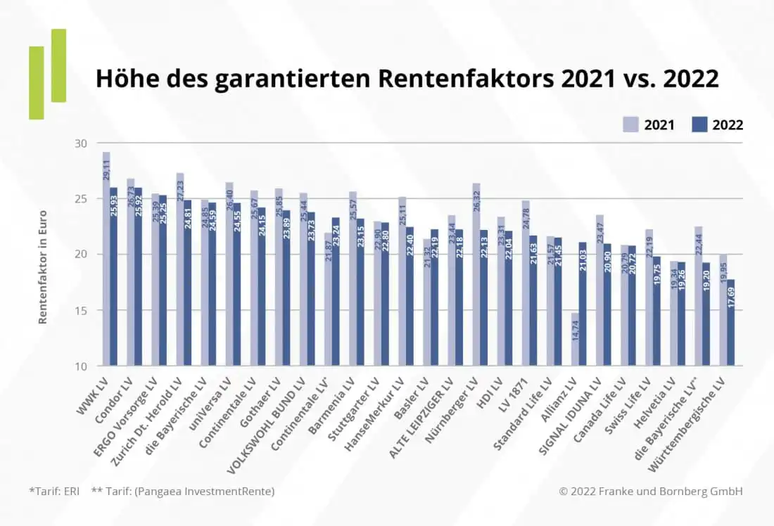 Marktüberblick über die Höhe der garantierten Rentenfaktoren im Vergleich 2021 zu 2022: