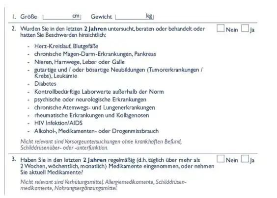 Sollte eine der Gesundheitsfragen hier jedoch mit „ja“ beantwortet werden, müssen reguläre Gesundheitsprüfungen durchgeführt werden.