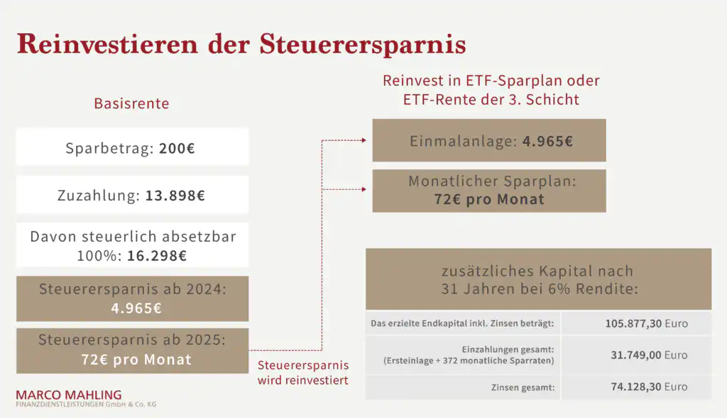 Bei einer Laufzeit von 31 Jahren und einer Rendite von 6 Prozent sind das 105.877 Euro, also die Verdreifachung der Steuerersparnis. Hinzu kommt das reguläre Kapital aus der Basis-Rente.