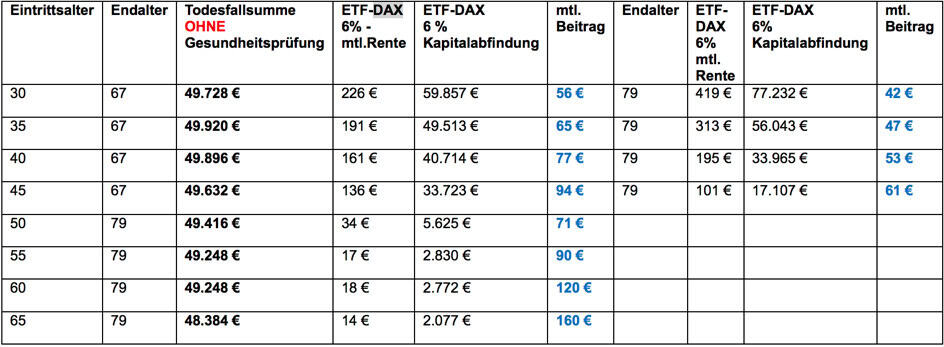 Hallo, irgendwie verstehe ich die Summen nicht. Im Text wird eine Risikosumme von 100.000,- ohne Gesundheitsfragen beworben, jedoch in den weiteren Ausführungen wird nur noch eine Summe von 50.000,- EURO angegeben. Kann mir das jemand erklären? Danke!