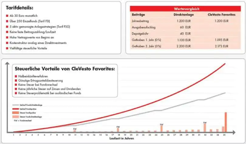 Anhand der folgenden Tabelle können Sie zwischen einem normalen Fondsdepot (Fondssparplan) und dem Fondsangebot des Versicherers (hier: Heveltia CleVesto Favorites) vergleichen: